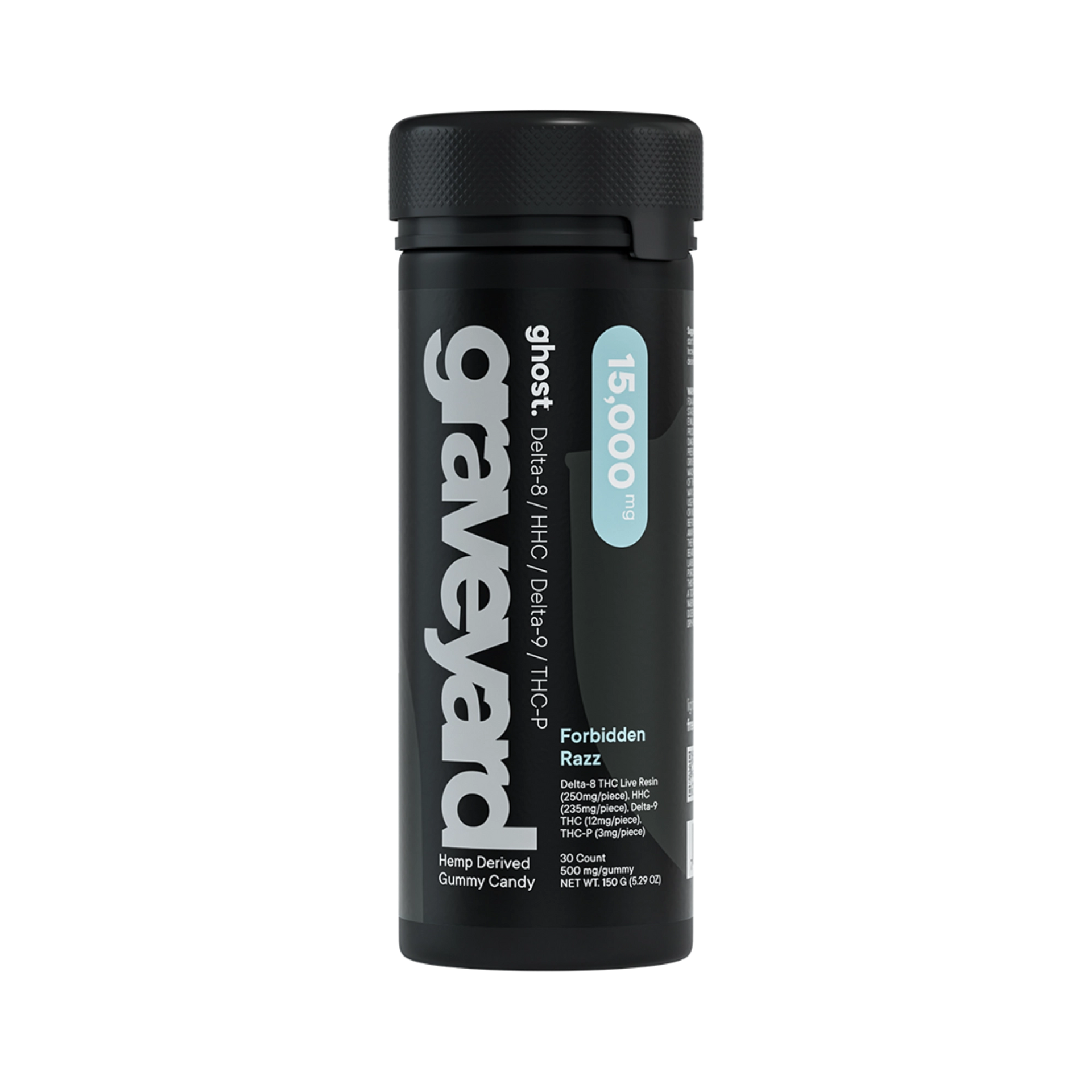 Indulge in the rich and mysterious Forbidden Razz Graveyard Gummies. Each jar contains 15,000mg of Delta-8 THC, HHC, Delta-9 THC, and THC-P, delivering a potent and delicious blue raspberry flavor.