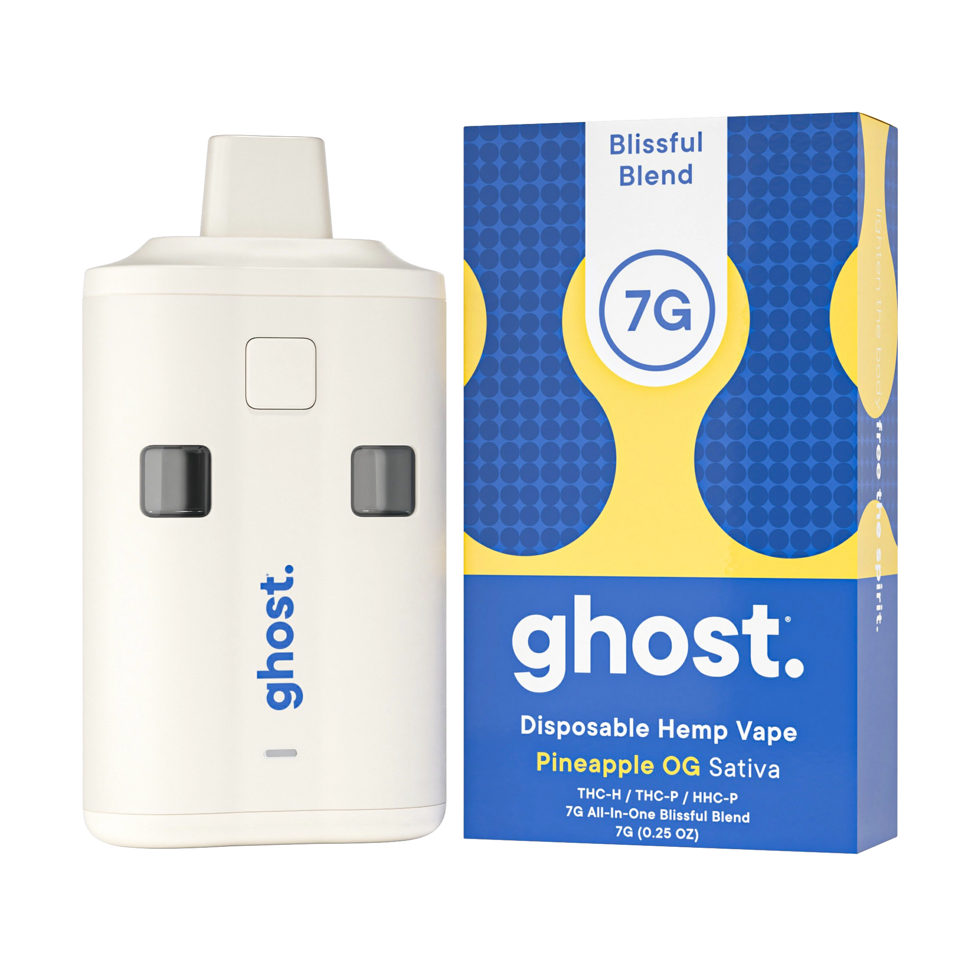 Enjoy the tropical bliss of Pineapple OG Blissful Blend. With 7 grams of THC-A, THC-P, and HHC-P per device, this exotic vape energizes your day with every puff.